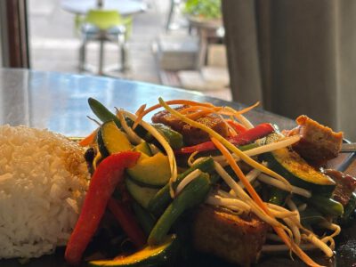 Zartes Hühnerfleisch mit farbenfrohen Gemüse in einer Komos-Galgantwurzel-Soße und Kräuter. Dazu servieren wir duftenden Reis.