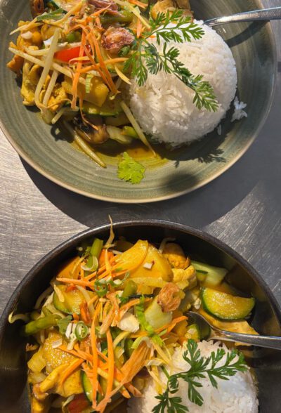 Zartes Hühnerfleisch mit Marktgemüse in einer Zitronengras-Bohnen-Soße und Kräuter. Dazu servieren wir Duftreis.