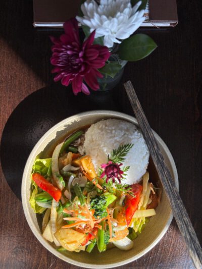Buntes Marktgemüse mit Tofu (vegan) abgerundet mit einer cremigen Kokos-Soße und Kräutern. Dazu servieren wir Duftreis.